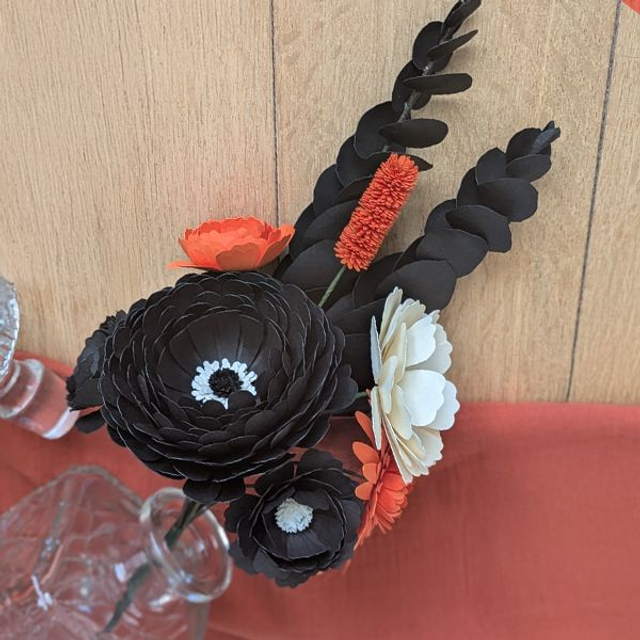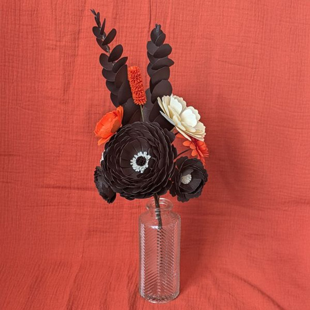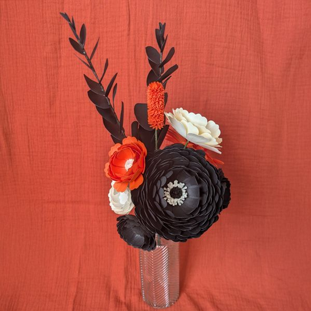 Un bouquet unique et envoûtant, entièrement façonné à la main, mêlant fleurs en papier noir, orange et beige. L’eucalyptus noir apporte une touche mystérieuse et élégante, parfaite pour célébrer Halloween avec originalité et raffinement.