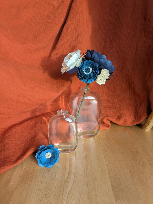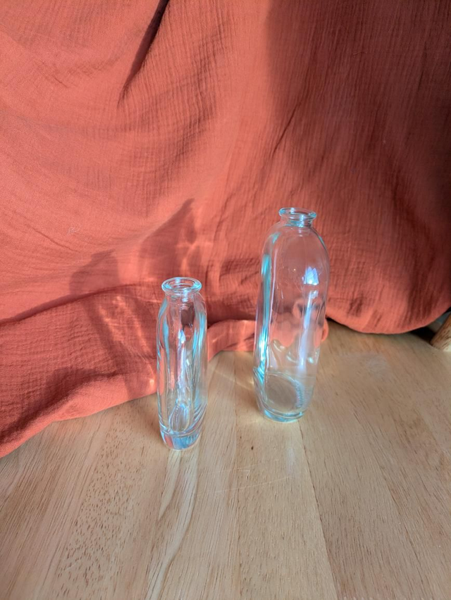 Deux vase transparents de frome rectangle , hauts, à petit goulot parfait pour un bouquet de fleurs en papier léger.