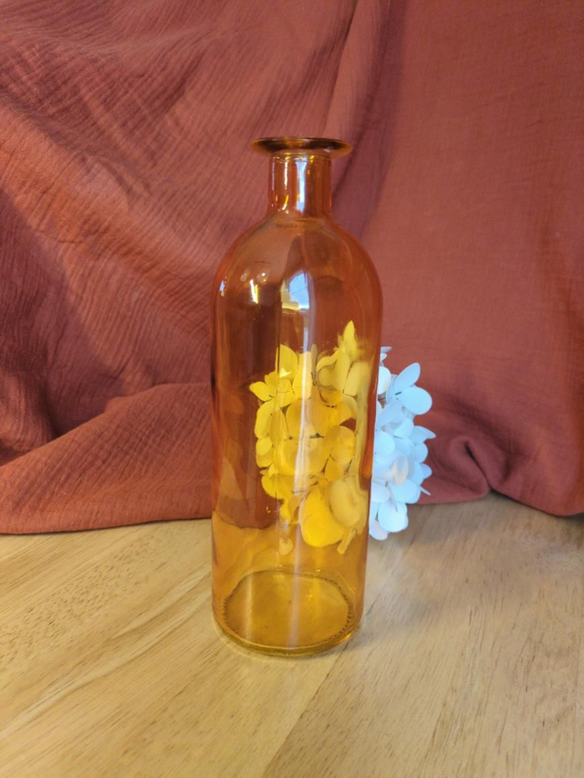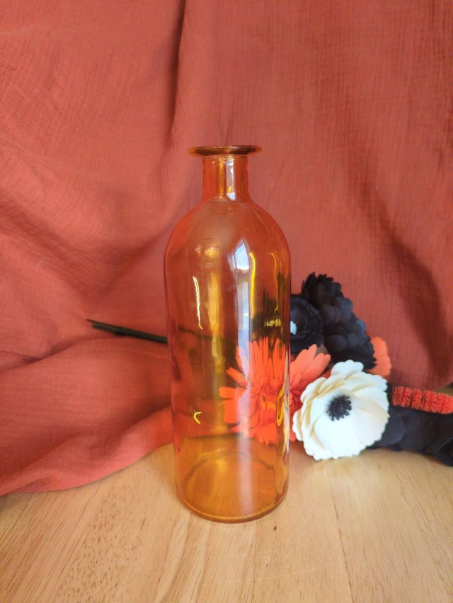 Vase haut en verre teinté orange acidulé de forme bouteille.